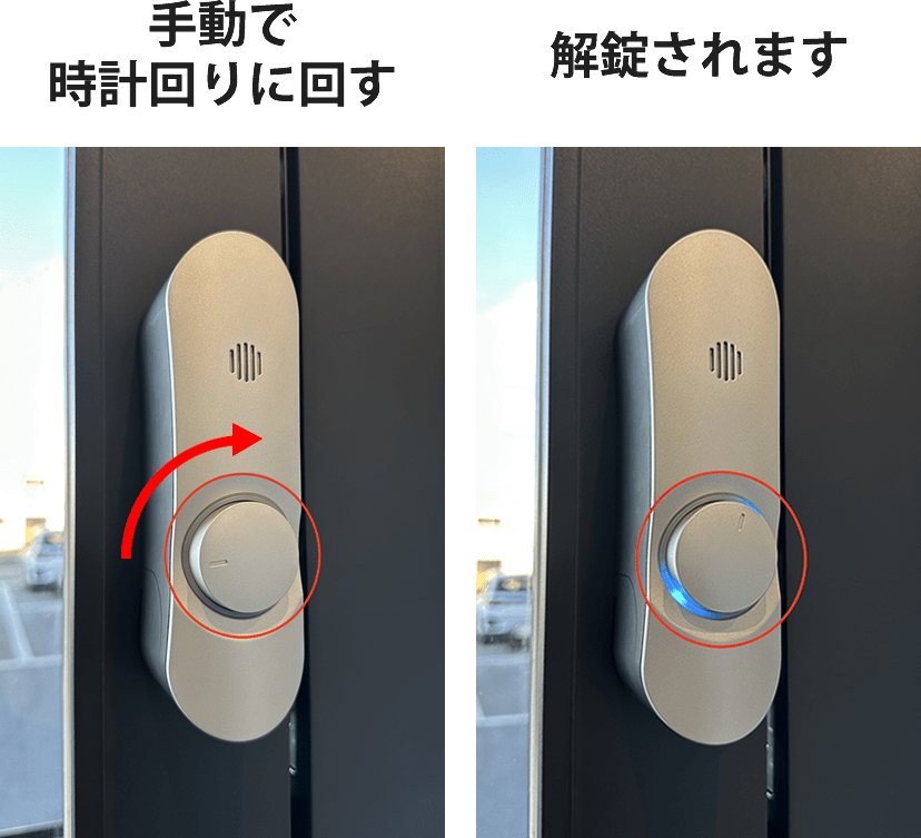スマホが使用できない、またはアプリが起動しないなどの緊急時には、ドア内側の丸い部分を手動で時計回りに回していただくと解錠が可能です。